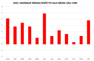 Nel corso dell’anno vi abbiamo esposto i resoconti delle varie stagioni, inverno, primavera, autunno. Per concludere il 2025 manca all’appello il mese di dicembre che verrà infatti inserito nel report della stagione invernale 2025-2026. Diamo solo un’anticipazione delle temperature registrate così da completare l’anno solare 2025. Dicembre scorso è stato un mese molto mite, in particolare l’anomalia mensile rispetto alla media recente 1994-2023 è stata di +2°C e rispetto alla media 1961-1990 è stata di ben +3,8°C. Possiamo partire ora con il resoconto dell’anno appena terminato.