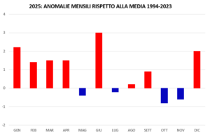 I mesi maggiormente responsabili dell’anomalia di temperatura sono stati giugno, gennaio e dicembre, abbiamo avuto anche 4 mesi con il segno “-“ seppur con anomalia molto contenuta, questi mesi sono stati maggio, luglio, ottobre e novembre.