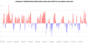 Per chi volesse vedere l’anomalia giorno per giorno di questo 2025 ecco il riassunto giornaliero e il grafico totale annuale con le anomalie giorno per giorno rispetto alla media recente.