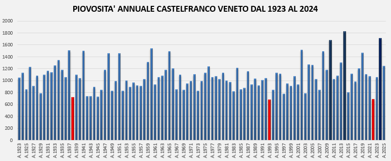 Passiamo ora al lato pluviometrico, il 2025 chiude circa in media pluviometrica a livello regionale, leggermente sotto media sui monti. E’ stato un anno diviso in 2 parti dal punto di vista pluviometrico, fino a settembre si viaggiava su importanti surplus di pioggia, poi negli ultimi 3 mesi dell’anno ha piovuto veramente poco, addirittura con record in alcune stazioni Arpav montane nel periodo ottobre-dicembre che solitamente è molto piovoso sui nostri monti. Tutto ciò non ci meraviglia più di tanto, sappiamo che tra periodi secchi e periodi piovosi spesso ci sono differenze enormi, ultimamente però si nota una certa estremizzazione in entrambi i contesti. Ribadiamo che la piovosità nel complesso sul nostro territorio non sta subendo particolari trend al ribasso e questo lo si nota bene dal grafico degli ultimi 100 anni, il problema è appunto l’estremizzazione dei periodi secchi e di quelli piovosi. è l’estremizzazione dei periodi piovosi e degli eventi in sé, da notare infatti che i 2 anni più secchi e i 3 anni più piovosi sono tutti appartenenti agli ultimi 30-35 anni, su una serie di un secolo.