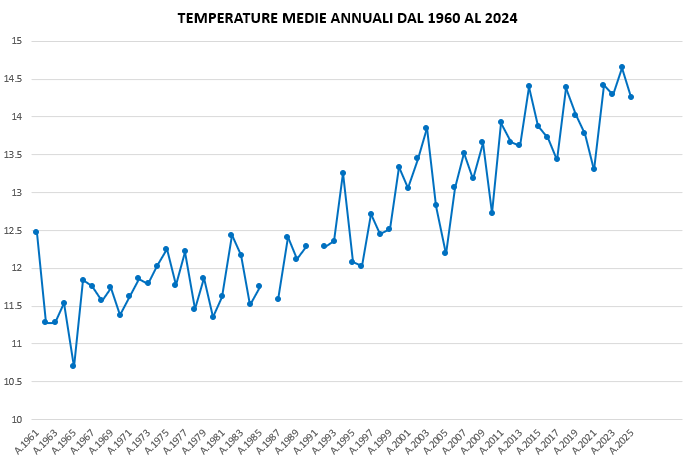 Qui sotto alleghiamo il grafico che ci mostra la temperatura media annuale dal 1960 ad oggi a Castelfranco Veneto, come potete notare il 2025 con una temperatura media annuale di 14,26°C si piazza al sesto posto tra i più caldi. Il trend verso il rialzo a partire dagli anni ’80 è netto, i 6 anni più caldi sono tutti negli ultimi 12 anni.