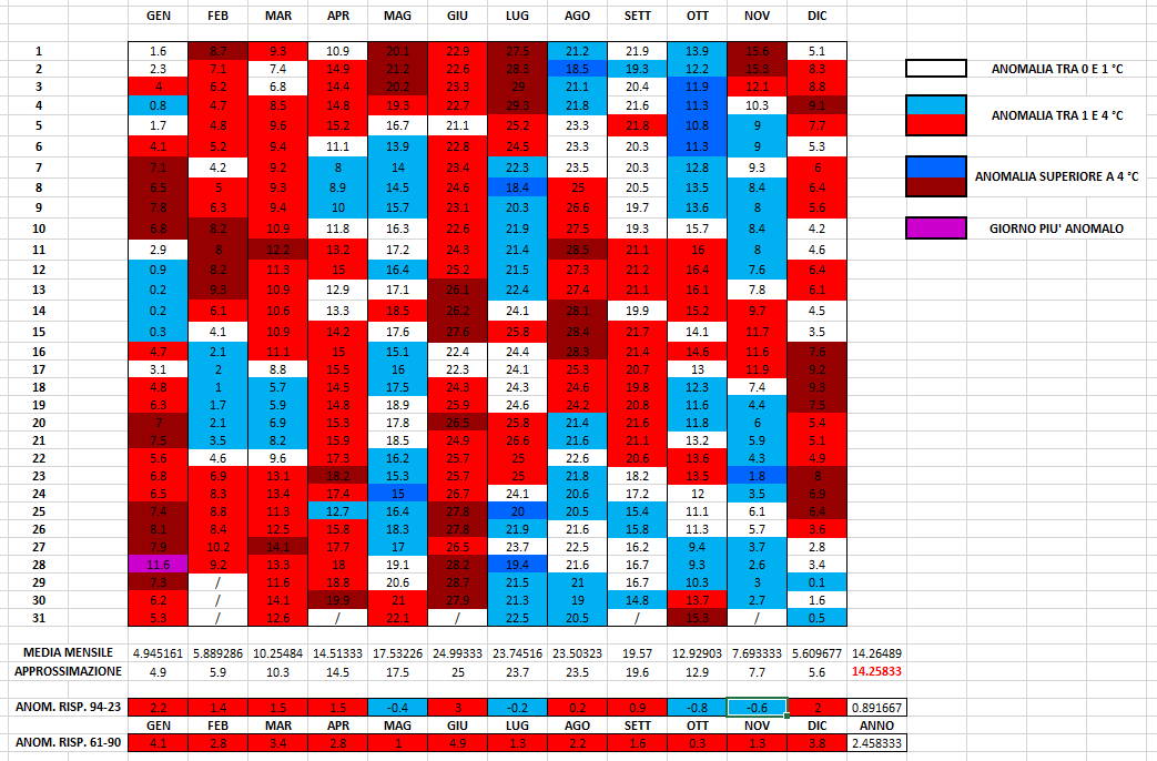 I mesi maggiormente responsabili dell’anomalia di temperatura sono stati giugno, gennaio e dicembre, abbiamo avuto anche 4 mesi con il segno “-“ seppur con anomalia molto contenuta, questi mesi sono stati maggio, luglio, ottobre e novembre.