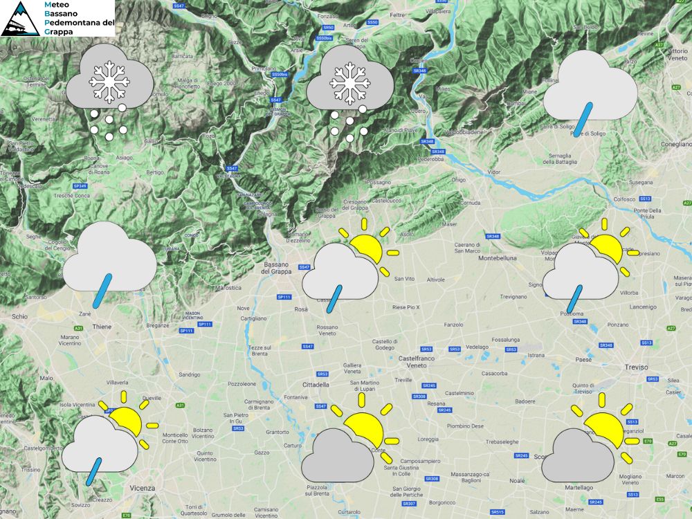Una perturbazione atlantica attraversa il nostro territorio nella giornata di giovedì portando molte nubi e precipitazioni diffuse soprattutto nella prima parte del giorno ma con instabilità che proseguirà fino a fine giornata. La quota neve subirà modifiche nel corso della giorno come esposto di seguito: al mattino cielo coperto con piogge via via più diffuse ed insistenti in pianura e nevicate in montagna. Quota neve sul versante sud prealpino inizialmente fino a 700-800m ma in rapido aumento con possibili fasi di pioggia fino a 1500-1600m attorno all’orario pranzo. Più a nord sulle valli invece avremo quota neve probabilmente fino a fondovalle all’alba con tendenza a successiva virata in pioggia sulla Valbelluna centro-orientale e maggior resistenza invece sul feltrino, Valle di Seren, Arsiè e parte della Valsugana seppur con situazione via via più al limite. Nel pomeriggio ancora precipitazioni sui settori montani con quota neve stabile o in lieve calo sulle Prealpi attorno ai 1400m e pioggia sulle valli. In pianura invece avremo tempo spiccatamente instabile con possibili schiarite sui settori più meridionali dove lo scirocco farà impennare le temperature anche fin verso i 13-14 gradi, su alte pianure e pedemontane maggiori annuvolamenti con sviluppo di nuovi rovesci soprattutto dopo il tardo pomeriggio. In serata avremo l’invorticamento della struttura depressionaria proprio sopra il Veneto e questo comporterà nuova instabilità sparsa con quota neve attorno ai 1200-1300m sulle Prealpi nelle aree interessate dalle precipitazioni. Nel complesso avremo accumuli attorno ai 15-20mm sulle medio-basse pianure, 30-40mm su alte pianure e pedemontane, 40-50mm sulle Prealpi con almeno 30-35cm di neve a Cima Grappa che dovrebbe resistere per tutto il peggioramento seppur con neve un po’ più pesante tra tarda mattinata e primo pomeriggio. Le temperature saranno in aumento in quota fino a metà giornata e poi in leggero calo. In pianura minime in netto aumento e massime in leggero calo sui settori a nord e in aumento invece sui settori meridionali quando nel pomeriggio potremo superare come detto anche i 13-14 gradi in caso di schiarite.