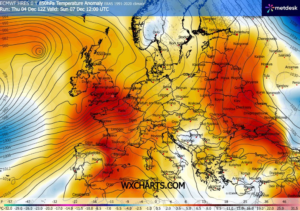 Inizio inverno decisamente mite sul nostro territorio, ormai sembra una barzelletta, dopo un autunno che tutto sommato ha mostrato anche alcuni periodi freddi con dicembre è iniziato l’inverno meteorologico e la mitezza atlantica è tornata a comandare su tutta l’Europa. Si prospetta un lungo periodo di temperature sopra la media con il ritorno anche dell’alta pressione subtropicale nei prossimi giorni accompagnata da temperature primaverili in quota e un po’ di inversione termica in pianura ma solo di notte mentre di giorno supereremo facilmente i 10 gradi, nebbie permettendo (al momento poco probabili sulle alte pianure). Nell’immagine qui sotto ecco infatti l’anomalia termica prevista in Europa, non c’è molto da dire, praticamente temperature sopra la media quasi ovunque nei prossimi giorni e, con l’arrivo dell’alta pressione, le anomalie maggiori passeranno dalle basse quote alle alte quote.