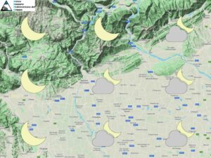 Correnti atlantiche riportano aria umida e più mite sul nostro territorio, nei bassi strati tuttavia resisterà uno strato d’aria più fredda con valori sottozero di notte sulle medio-alte pianure meno interessate dalla nuvolosità. Massime invece in generale lieve aumento in pianura, valori in netto aumento in quota dove torneranno attorno alla media stagionale o poco al di sopra. Attendibilità: media