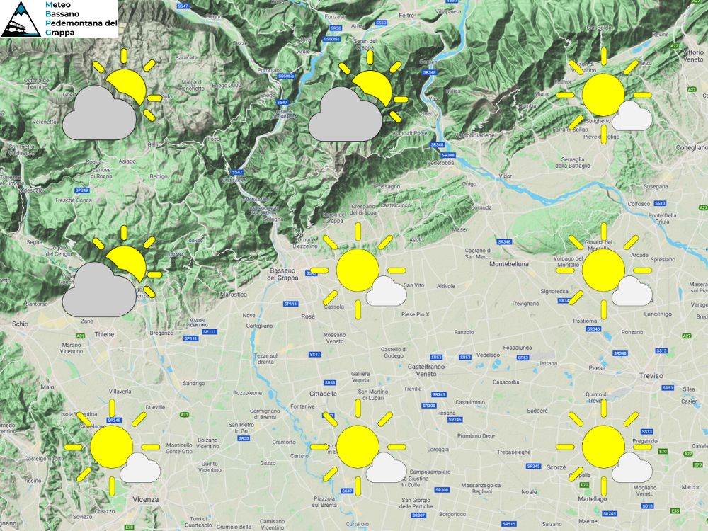 Il weekend si conclude con una domenica praticamente estiva sul nostro territorio, avremo un po’ di nuvolosità in più sulle Prealpi con qualche locale piovaschi ma sempre con rischio basso mentre altrove dominerà il sole e le temperature massime saranno da fine maggio/inizio giugno. Al mattino la giornata inizierà con cielo sereno ovunque, nel pomeriggio poi ancora tanto sole e clima caldo per il periodo sulle pianure, annuvolamenti sparsi sui monti ma con al più qualche isolato rovescio. In serata il cielo sarà parzialmente nuvoloso per il transito di nuvolosità innocua. Temperature in ulteriore lieve aumento con punte oltre i 26 gradi in pianura.