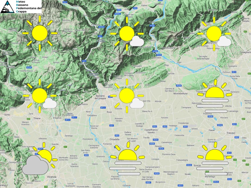 Correnti umide sud-occidentali iniziano a portare umidità e nubi basse sparse sui nostri cieli, la giornata trascorrerà comunque con schiarite prevalenti ma con clima umido. Al mattino cielo poco nuvoloso, possibili nebbie sulle pianure meridionali, in dissolvimento. Nel pomeriggio nubi sparse sulle pianure e in pedemontana, cieli sereni ad alta quota sulle Prealpi e in genere sui settori montani a nord. In serata nuvolosità in ulteriore aumento in pianura fino a cielo nuvoloso nella notte.