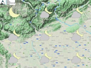 Una debole perturbazione attraversa il Veneto portando molte nubi ma poche piogge, addirittura assenti su alcuni settori. Deboli nevicate a quote alte, oltre i 2200m. Temperature in calo in quota, stazionarie in pianura nei valori minimi e in calo in quelli massimi. Clima umido. Attendibilità: media