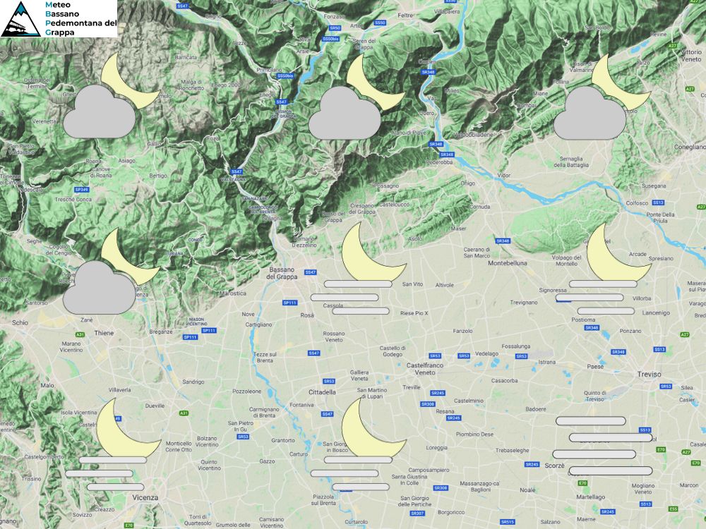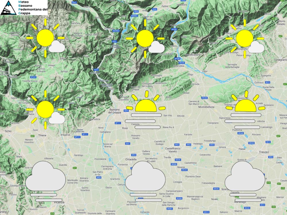 Un campo di alta pressione continua a stazionare sull’Italia e quindi anche sul nostro Veneto, le condizioni meteo quindi si presentano stabili e ben soleggiate in quota mentre sulle pianure l’elevata umidità produce nebbie e nubi basse soprattutto di notte e a inizio giornata. Al mattino cielo sereno o poco nuvoloso in quota, probabili nebbie invece in pianura in successivo graduale dissolvimento. Nel pomeriggio ancora bel tempo con aperture anche sulle pianure seppur con foschie e nubi basse sparse. In serata poi tornano a formarsi banchi di nebbia sulle aree pianeggianti mentre in quota il cielo sarà sereno. Temperature minime stazionarie, massime in rialzo. Valori un po’ più bassi sulle medie e basse pianure dove avremo maggiore umidità