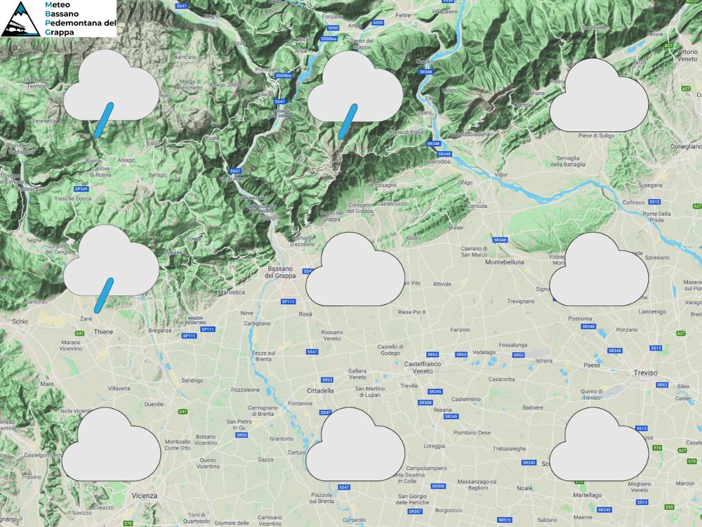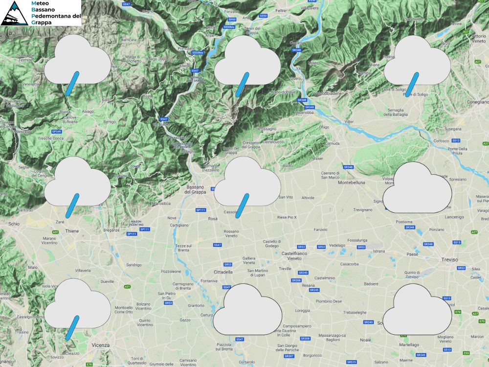 Probabilità di precipitazioni settore pianura: 50% tra mattino e pomeriggio, 100% in serata.