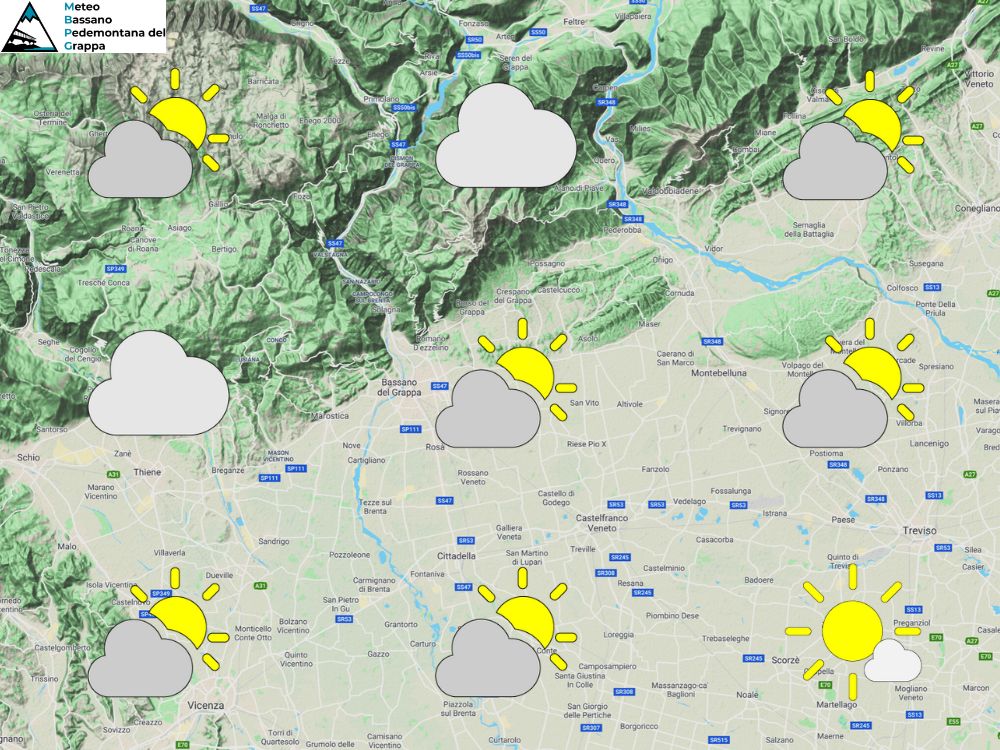 Ancora tempo variabile con momenti soleggiati alternati a nuvolosità sparsa senza precipitazioni. Temperature stazionarie su valori attorno alla media stagionale in pianura e leggermente al di sotto in quota. Attendibilità: medio-alta