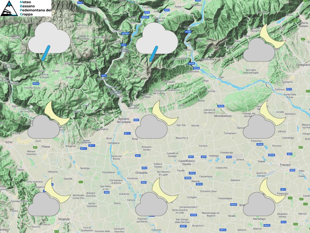 Probabilità di precipitazioni settore pianura: 20% pedemontane e alte pianure, 0-5% altrove.