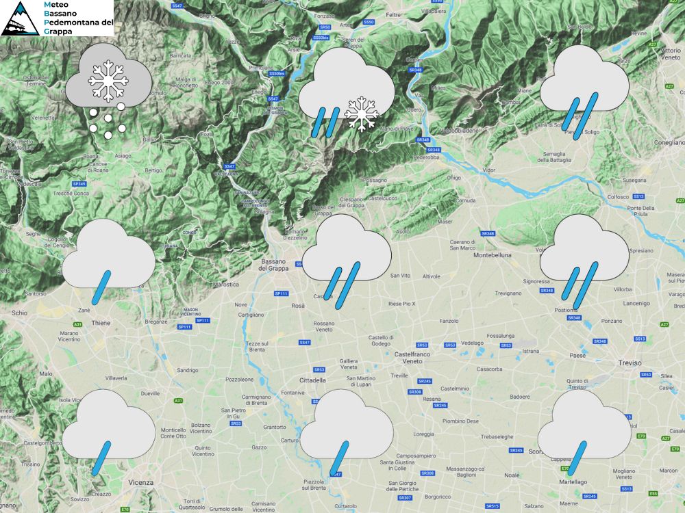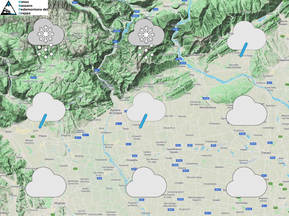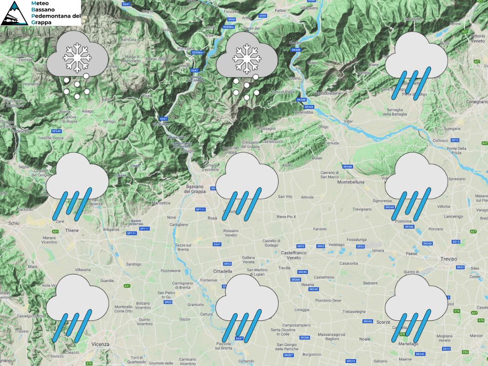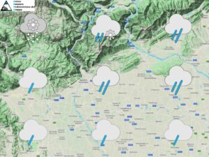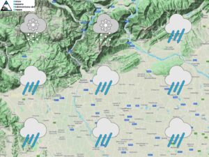 Un’intensa perturbazione atlantica porta maltempo diffuso su tutta la nostra Regione con piogge in pianura e nevicate in montagna a quote via via più alte. Le temperature infatti saranno in aumento a tutte le quote. Nella notte e al mattino precipitazioni diffuse con neve oltre i 700-800m sulle Prealpi sul versante sud e fino a 300-400m più a nord con episodi possibili anche fino a fondovalle su Valsugana e Valbelluna. Nel corso del mattino poi quota neve in graduale rialzo. Nel pomeriggio ancora piogge sulle pianure e quota neve in aumento fino ai 1600m sul versante sud con rischio di qualche fase di pioggia mista a neve anche a Cima Grappa. In serata residui fenomeni tra Prealpi e pedemontane con quota neve in leggero calo a 1300-1400m. Temperature come detto in aumento soprattutto nelle minime. Ventilazione in rinforzo da sudest in quota e da nordest al suolo.