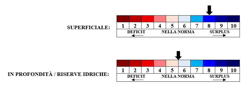 INDICATORE QUANTITÀ D’ACQUA PRESENTE NEL TERRITORIO: indicatore della situazione idrica media nel territorio a livello di strato superficiale (piogge recenti, evapotraspirazione) e in profondità/riserve idriche (falde, acque sotterranee, riserve idriche presenti su laghi e fiumi, quantità di neve presente sui monti). L’indicatore è elaborato direttamente da Meteo Bassano e Pedemontana del Grappa sulla base di dati di stazioni meteo a norma, livelli di falda, livelli di portata dei fiumi, nivometri ecc.