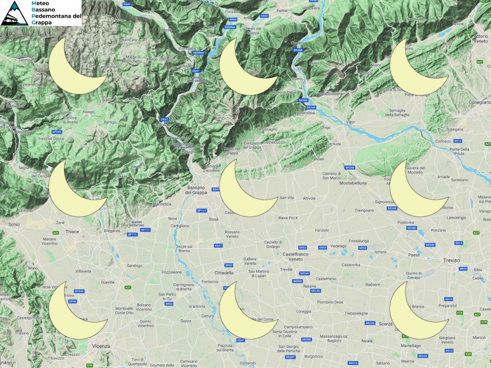 Situazione molto incerta, la struttura depressionaria con perno sul Tirreno continua a portare nubi sul nostro territorio in risalita da sudest. Al momento risulta difficile capire l’entità dei fenomeni che sembrano comunque sempre deboli e concentrati tra notte e primo mattino, da confermare. Temperature stazionarie. Attendibilità: bassa
