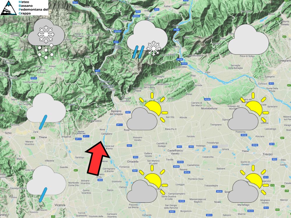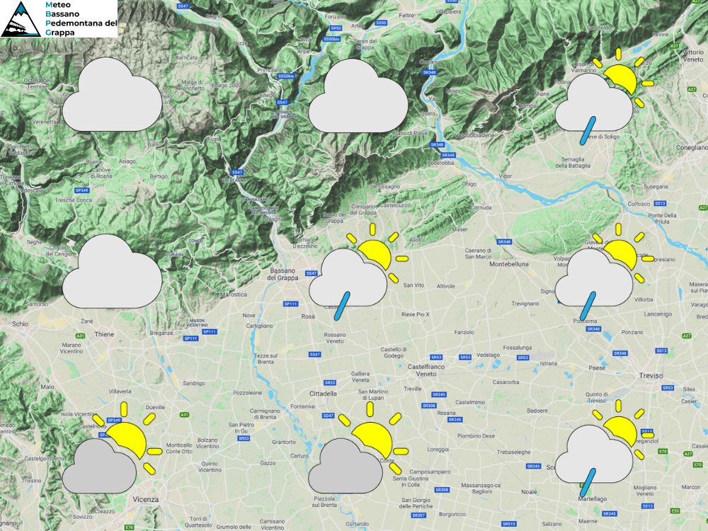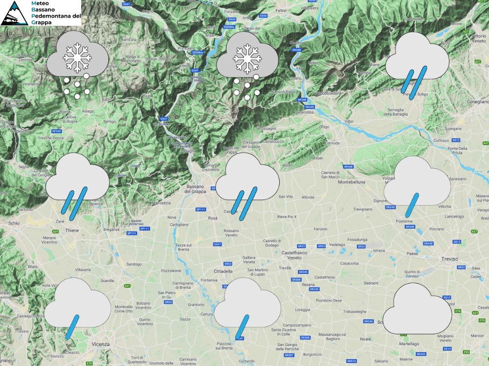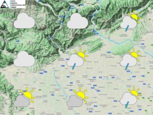 Probabilità di precipitazioni settore pianura: 70%, principalmente nel tardo pomeriggio-sera