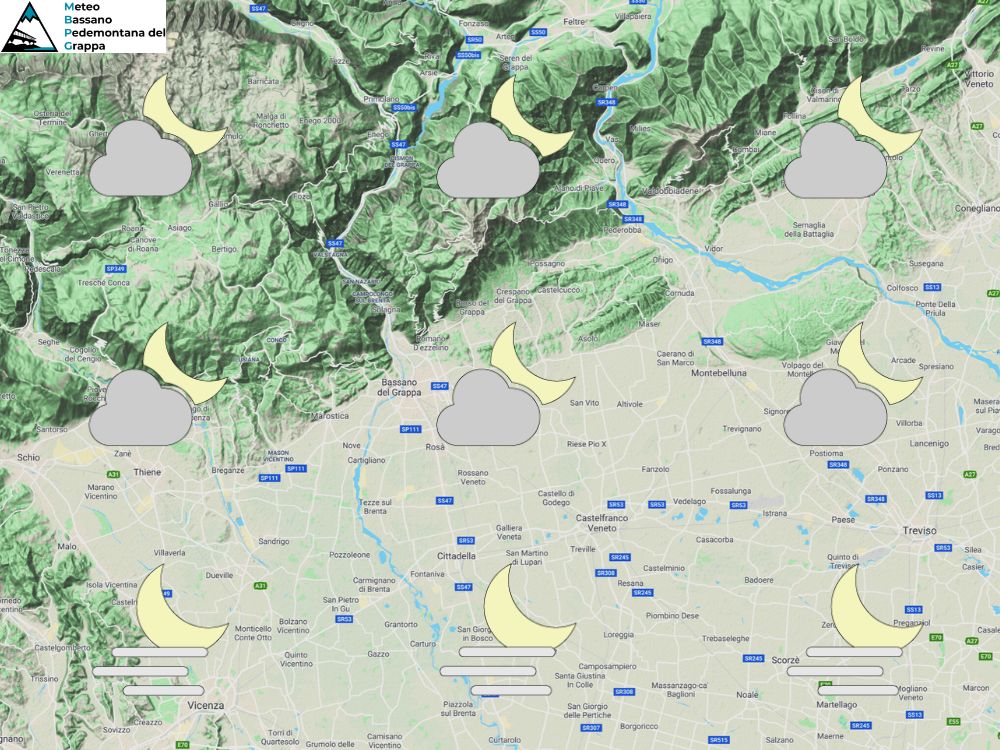 Una debole perturbazione attraversa il Veneto portando molte nubi ma pochi fenomeni, avremo al più qualche debole pioggia soprattutto sui settori occidentali, fenomeni irrisori altrove. Temperature in calo in quota, stazionarie in pianura nei valori minimi e in calo in quelli massimi. Clima umido. Attendibilità: media