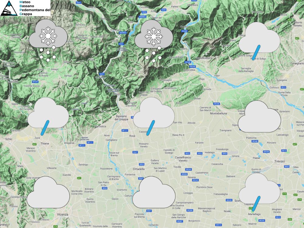 Una circolazione depressionaria porta altra instabilità sul nostro territorio con cieli molto nuvolosi e precipitazioni più probabili sui settori centro-occidentali. Dal punto di vista termico le temperature saranno in nuovo calo con neve a quote medio-basse. Al mattino cielo coperto con piogge anche diffuse sui settori occidentali, sparse e discontinue invece altrove. Quota neve attorno ai 600m ma con possibili sconfinamenti più in basso sulle valli prealpine e anche su ovest vicentino (Val Leogra, Val d’Astico, Valle dell’Agno ecc.). Nel pomeriggio ancora fenomeni sparsi su alte pianure e fascia prealpina ma in graduale esaurimento, quota neve in lieve rialzo a 700m sul versante sud delle Prealpi. In serata cielo nuvoloso ma con bassa probabilità di precipitazioni. Temperature minime stazionarie, massime in ulteriore calo, clima freddo con vento di bora sostenuto.