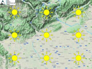 L’alta pressione porta tempo stabile e soleggiato sul nostro territorio con cieli totalmente sereni soprattutto in pianura ma il sole dominerà anche sui settori montani con rischio pioggia nullo. Dal punto di vista termico assisteremo ad un netto aumento con valori che si riporteranno oltre la media nelle massime pomeridiane. Al mattino cielo ovunque sereno, clima fresco all’alba con minime attorno ai 5-7 gradi in pianura. Nel pomeriggio tanto sole su tutti i settori, qualche nube sparsa ci sarà solamente sulla catena prealpina ma del tutto innocua e con soleggiamento prevalente. In serata non avremo alcuna variazione, cieli sereni o al più velati ovunque. Temperature come detto in aumento con massime che raggiungeranno e potranno superare i 23 gradi in pianura.